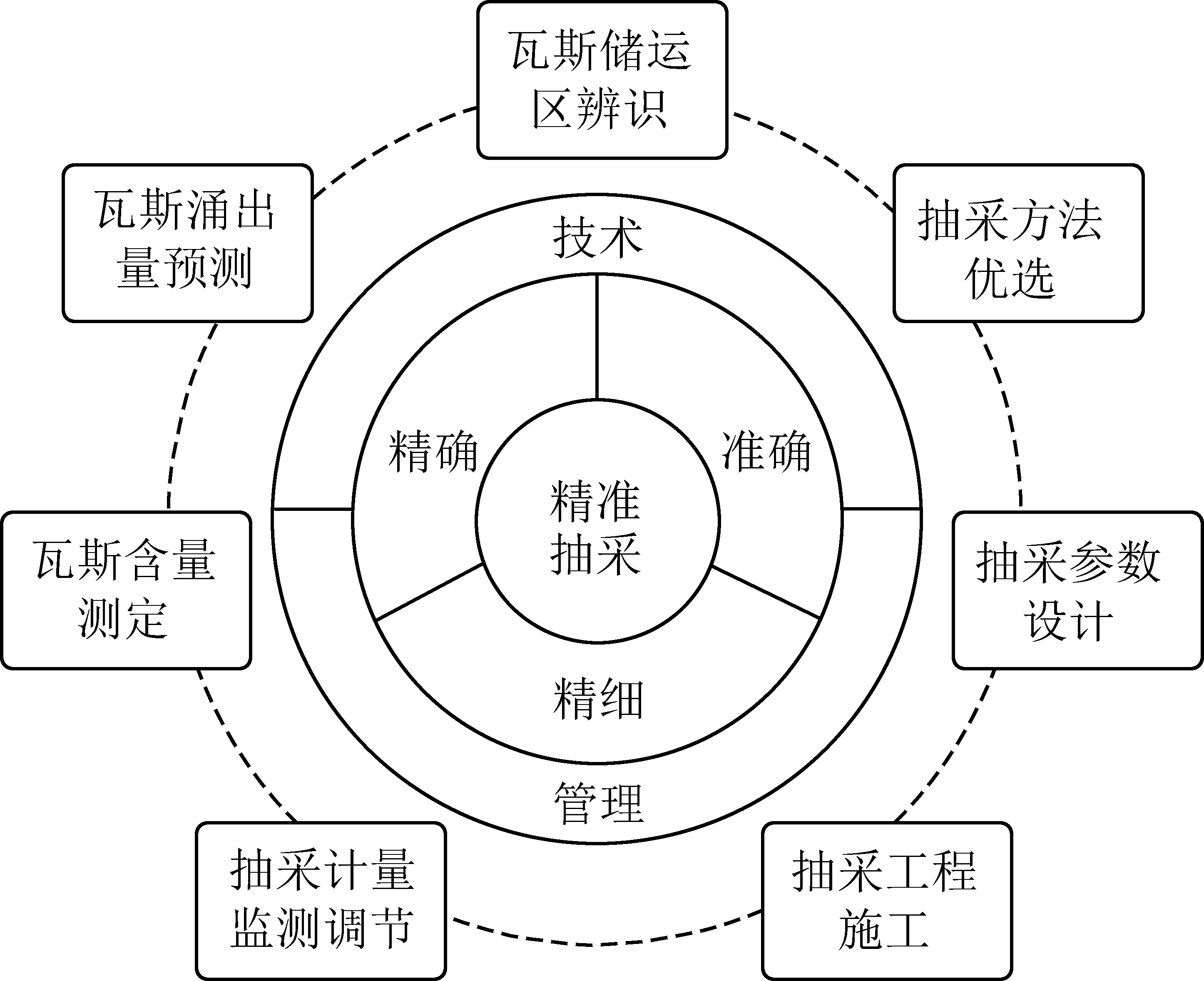 1)采动卸压瓦斯精准抽采包含“精确度”、“准确度”和“精细度”3个含义,围绕卸压瓦斯抽采全域全流程,从正确程度、误差程度来综合表征技术、工艺及方法,从丰富程度来表征管理过程。