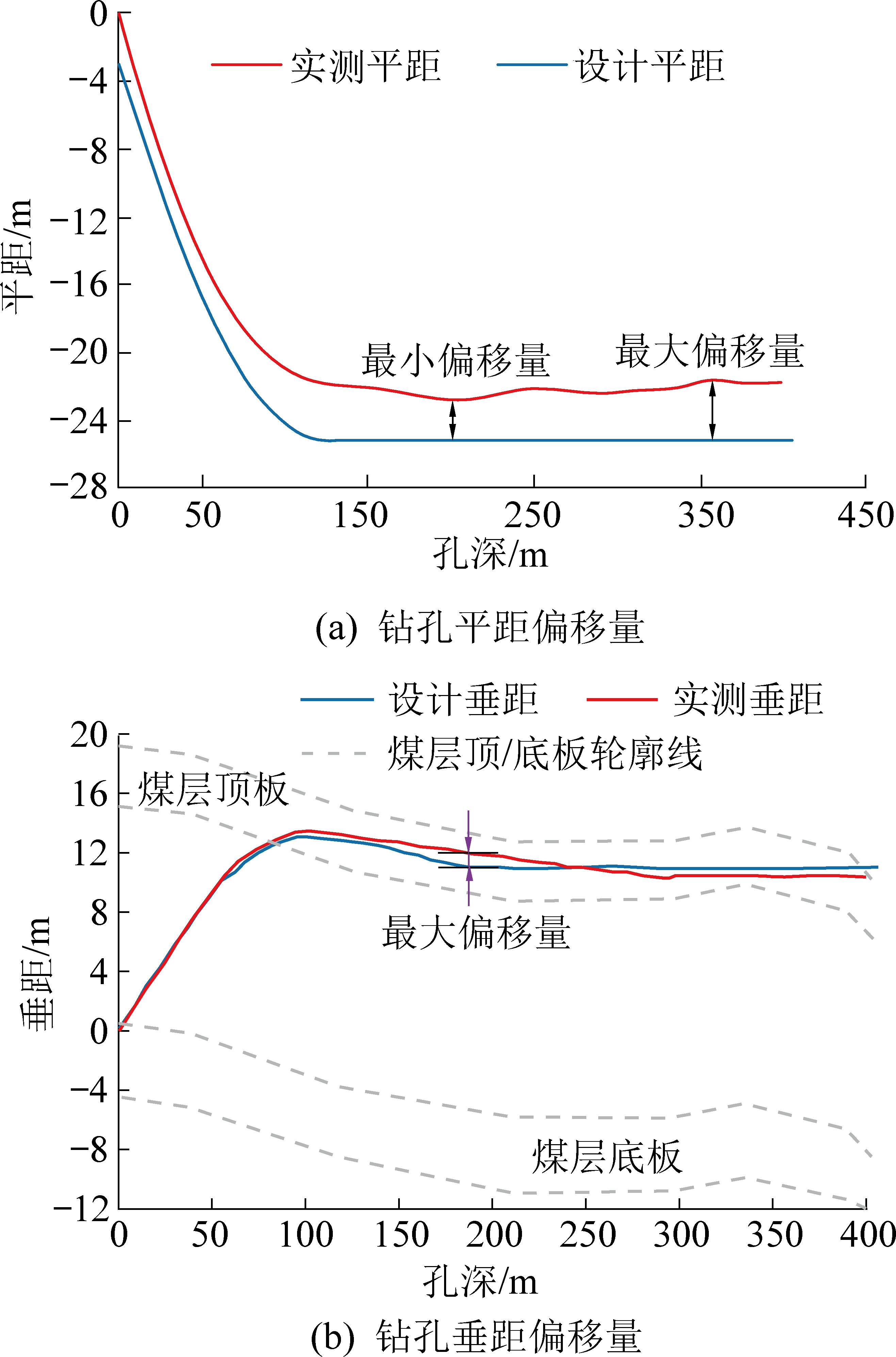 5)综合考虑试验工作面地质条件与钻机爬坡角度,设计每个钻场间距400 m,钻孔搭接距离50 m,设置5个钻场即可满足整个工作面全生命周期的瓦斯抽采需求。施工完成后,经过对比分析钻孔设计与施工轨迹,得到钻孔实测偏移量在2 m以内(图10),实现了钻孔的精准设计与施工。