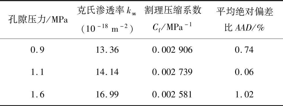孔隙压力/MPa克氏渗透率k∞(10-18m-2)割理压缩系数Cf/MPa-1平均绝对偏差比AAD/%0.913.360.0029060.741.114.140.0027390.061.616.990.0025811.02