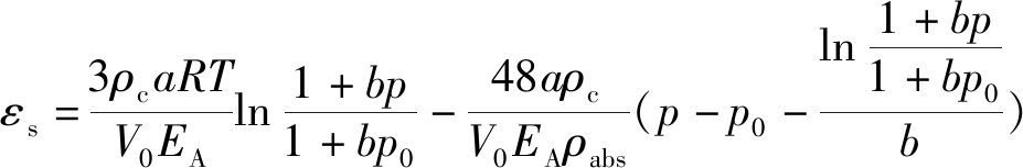 式中:εs为页岩吸附产生的体积应变;p0为初始孔隙压力,MPa;ρc为页岩密度,kg/m3;a、b为吸附常数,cm3/g、MPa-1;T为温度,K;ρabs为吸附相密度,299 kg/m3[22];V0为标准摩尔体积,约22.4×10-3 m3/mol;EA为页岩吸附所导致的膨胀模量,1900 MPa[25]。