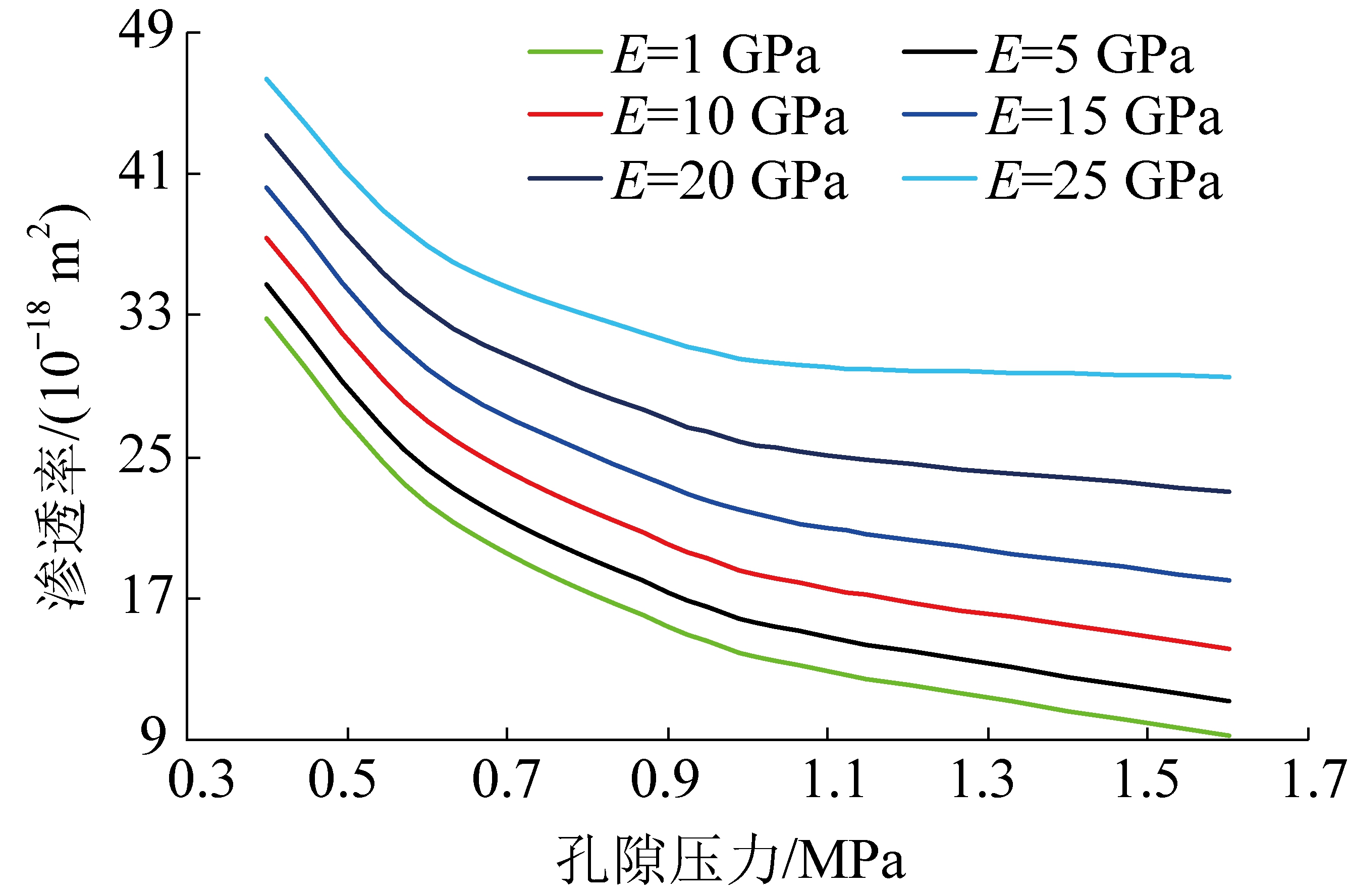 在恒定围压7.5 MPa条件下,根据式(32)模型,选择6个不同的弹性模量来探讨不同弹性模量条件下页岩表观渗透率与孔隙压力的关系(图5),由图5可知:弹性模量通常被用作衡量岩石产生弹性变形难易程度的指标,弹性模量增大会导致在其压力阶段内有较高的渗透率。弹性模量受到应力与应变关系的影响,在相同孔隙压力条件下,弹性模量较大的页岩基质变形量较小,且在页岩气抽采过程中,随孔隙压力降低,吸附气体解吸,此时弹性模量越大表明页岩的变形量越小,即在解吸过程中引起的基质变形量越小,页岩孔径增大量减小。因此,渗透率变化量也将随之降低。并且在低压条件下,气体扩散起主导作用,较小的流动孔径长度会引起更为明显的滑脱效应,渗透率也会相应升高。因此,表观渗透率模型对弹性模量较为敏感,且受水平方向的应变影响较大[15],且在低压条件下,页岩被压密作用减弱,孔隙率逐渐升高,渗流通道变宽,页岩表观渗透率升高。
