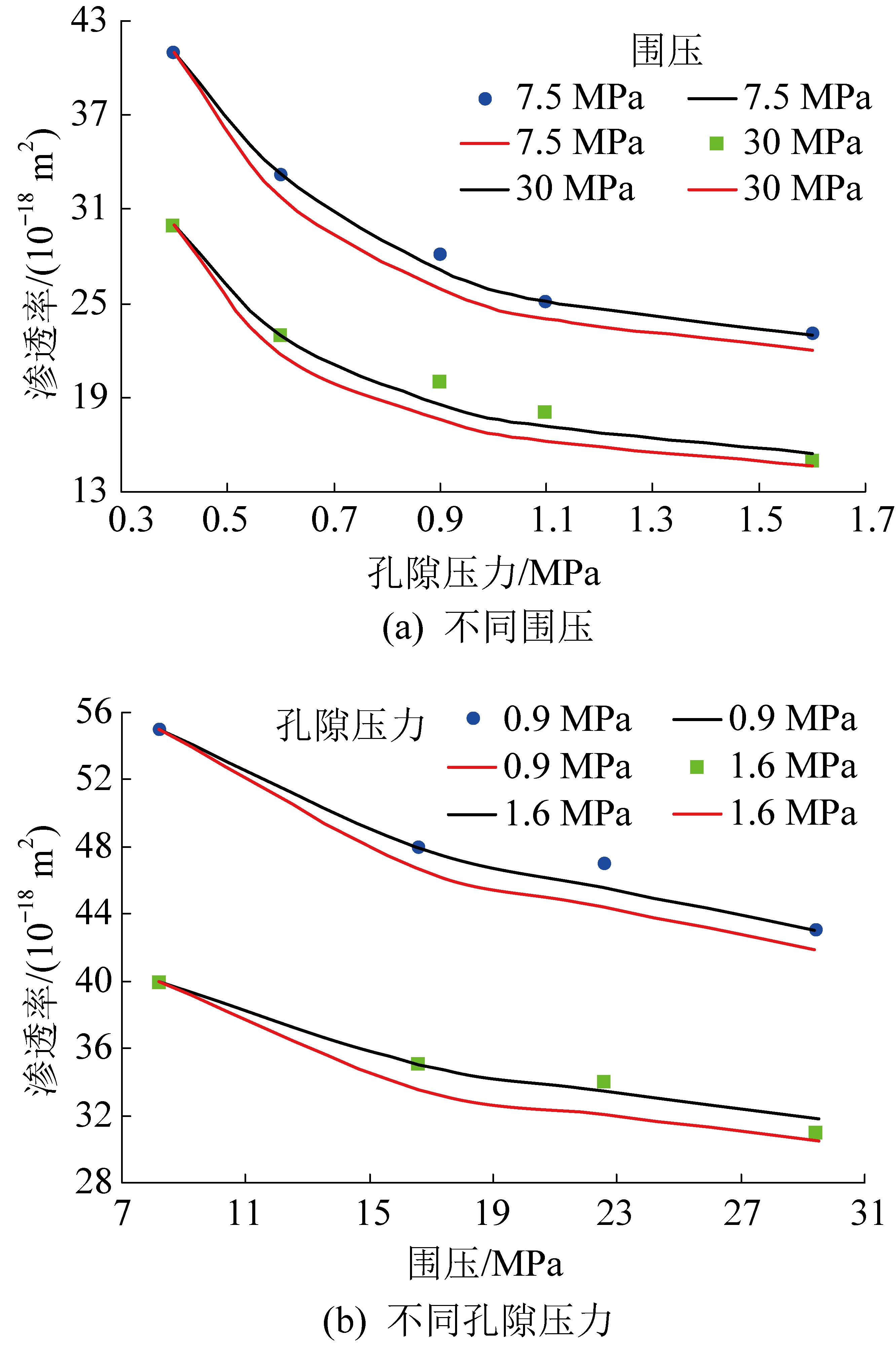 在不同围压条件下根据模型计算出的曲线与试验所测的渗透率值具有良好的一致性。页岩表观渗透率随孔隙压力的升高而呈指数函数形式降低。究其原因,随孔隙压力升高,页岩逐渐被压密压实,孔隙率逐渐降低,气体渗流难度逐渐升高。同时,随孔隙压力升高,页岩吸附作用逐渐增强,使吸附变形量和页岩表面吸附层厚度均变大,进而导致气体渗流通道变窄。