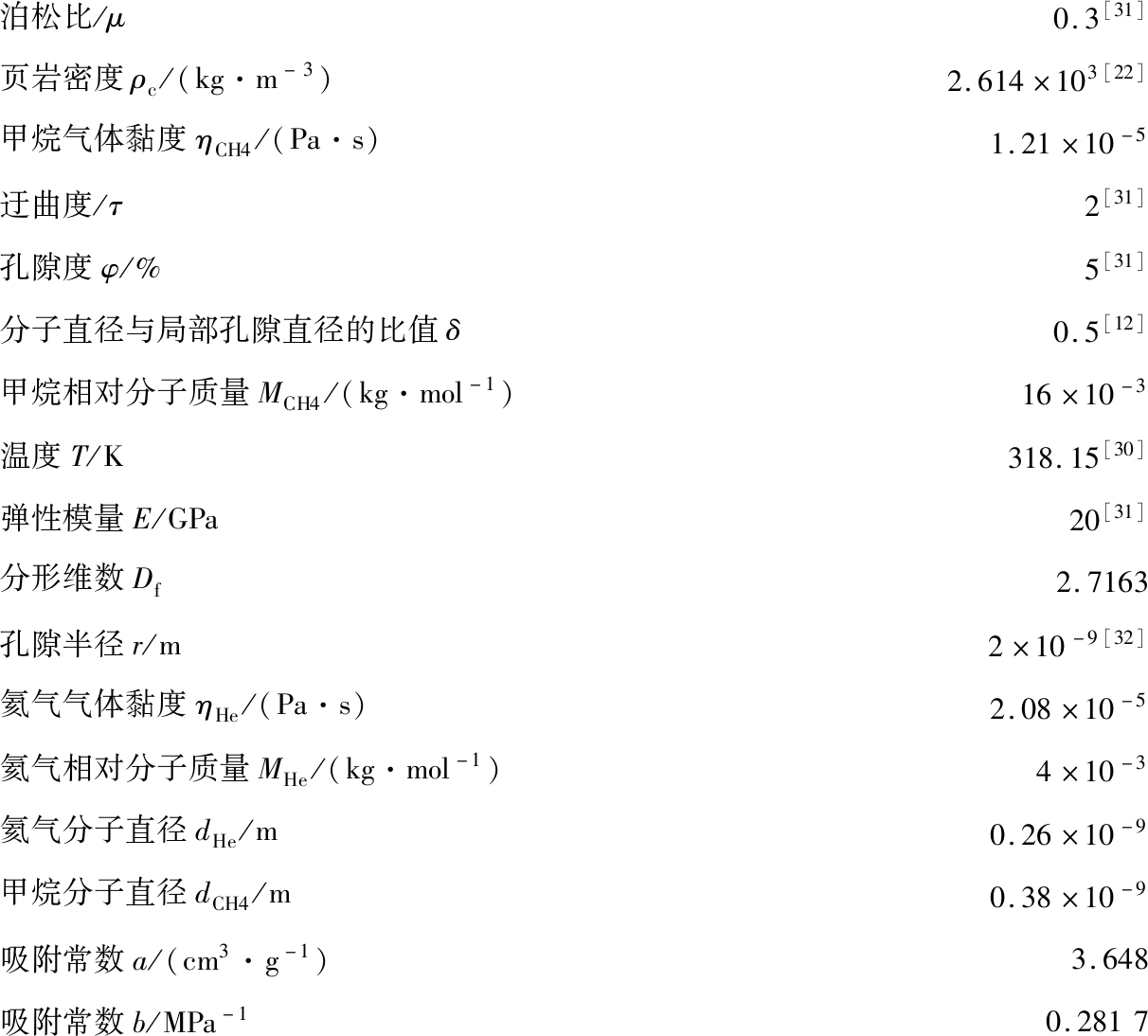 泊松比/μ0.3[31]页岩密度ρc/(kg·m-3)2.614×103[22]甲烷气体黏度ηCH4/(Pa·s)1.21×10-5迂曲度/τ2[31]孔隙度φ/%5[31]分子直径与局部孔隙直径的比值δ0.5[12]甲烷相对分子质量MCH4/(kg·mol-1)16×10-3温度T/K318.15[30]弹性模量E/GPa20[31]分形维数Df2.7163孔隙半径r/m2×10-9[32]氦气气体黏度ηHe/(Pa·s)2.08×10-5氦气相对分子质量MHe/(kg·mol-1)4×10-3氦气分子直径dHe/m0.26×10-9甲烷分子直径dCH4/m0.38×10-9吸附常数a/(cm3·g-1)3.648吸附常数b/MPa-10.2817