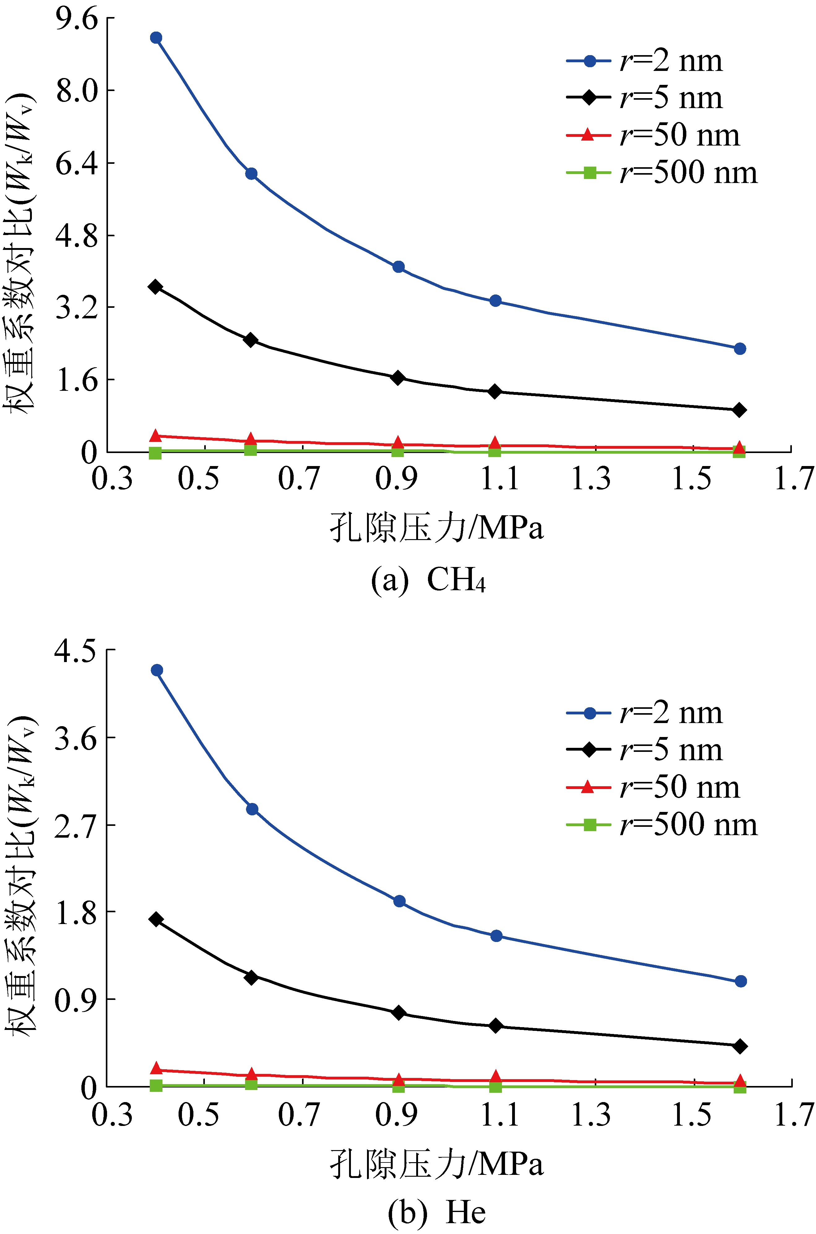 根据式(1)和式(2),权重系数是孔隙压力和孔径的函数。两个权重系数的相对贡献以(Wk/Wv)的形式体现如图4所示。