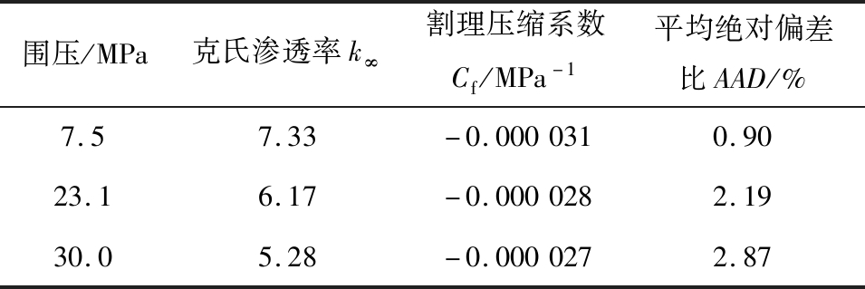 通过表1可以看出,新建模型与试验的渗透率值的平均绝对偏差比AAD较小,可靠性高。此外,新建模型计算的裂隙压缩系数Cf的绝对值整体呈现下降趋势。究其原因,随着围压的升高,页岩基质被压密,可压缩体积变小。因此,在较高的围压时,Cf的绝对值较小。这进一步证实了模型参数的合理性,而且变化的裂隙压缩系数更能真实的匹配模型[27]。