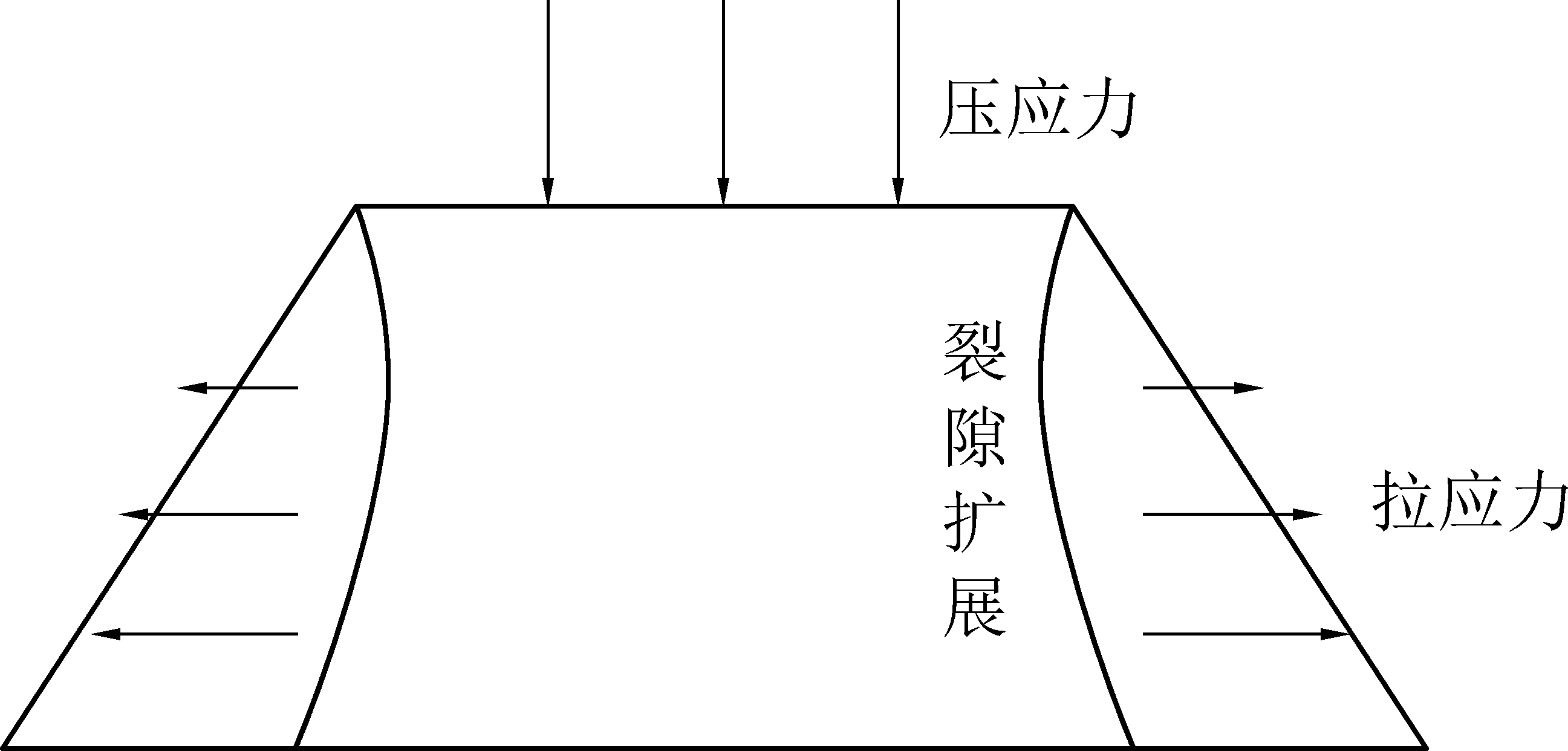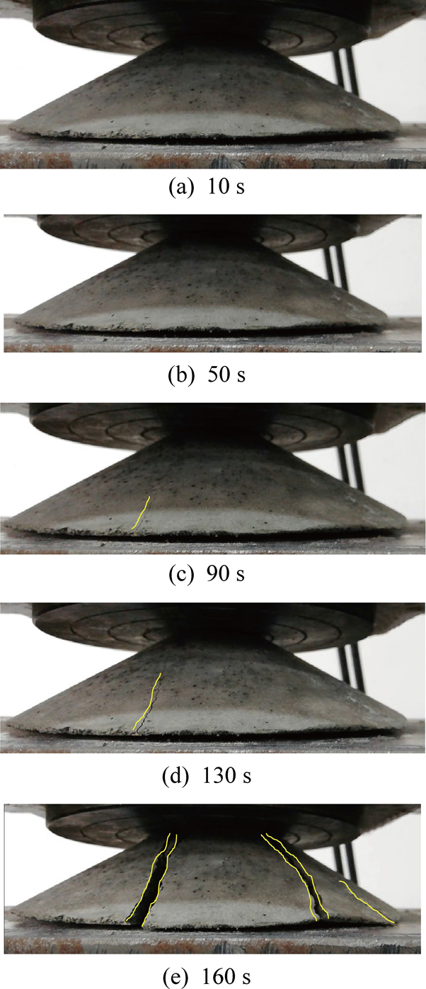 根据试验观察(图3),圆台试样均存在1个圆柱形受力核心区,由于竖向加压,圆柱形受力核心区以外的试样受到拉应力作用,使得受力核心区与周围材料分离,最终造成试样破坏。同时,正是由于周围材料对受力核心区提供围压,使得堆积角越小,围压越大,圆台试样的极限破坏力就越大。该过程的破坏模式,如图4所示。