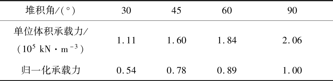 堆积角/(°)30456090单位体积承载力/(105kN·m-3)1.111.601.842.06归一化承载力0.540.780.891.00