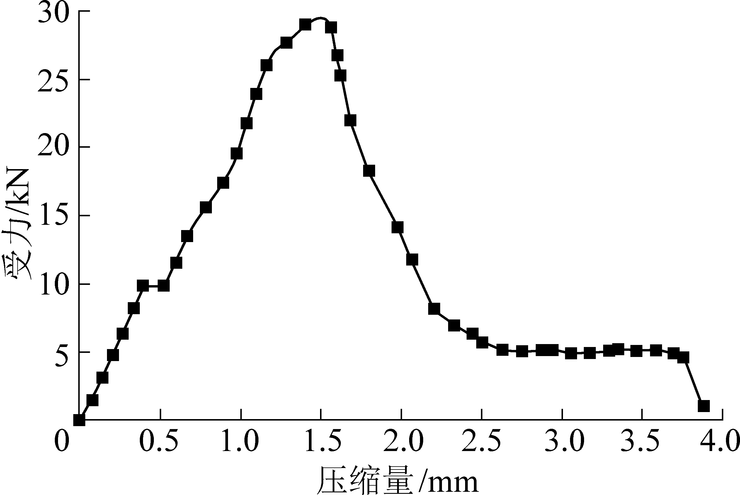 堆积角90°试样变形和受力关系如图5所示,由图5可知,当高浓度浆液充填墩柱试样堆积角为90°时,即圆柱试样,其抗压过程中受力和变形曲线与典型的受压应力-应变曲线相近。
