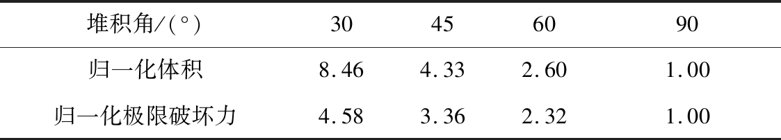 堆积角/(°)30456090归一化体积8.464.332.601.00归一化极限破坏力4.583.362.321.00