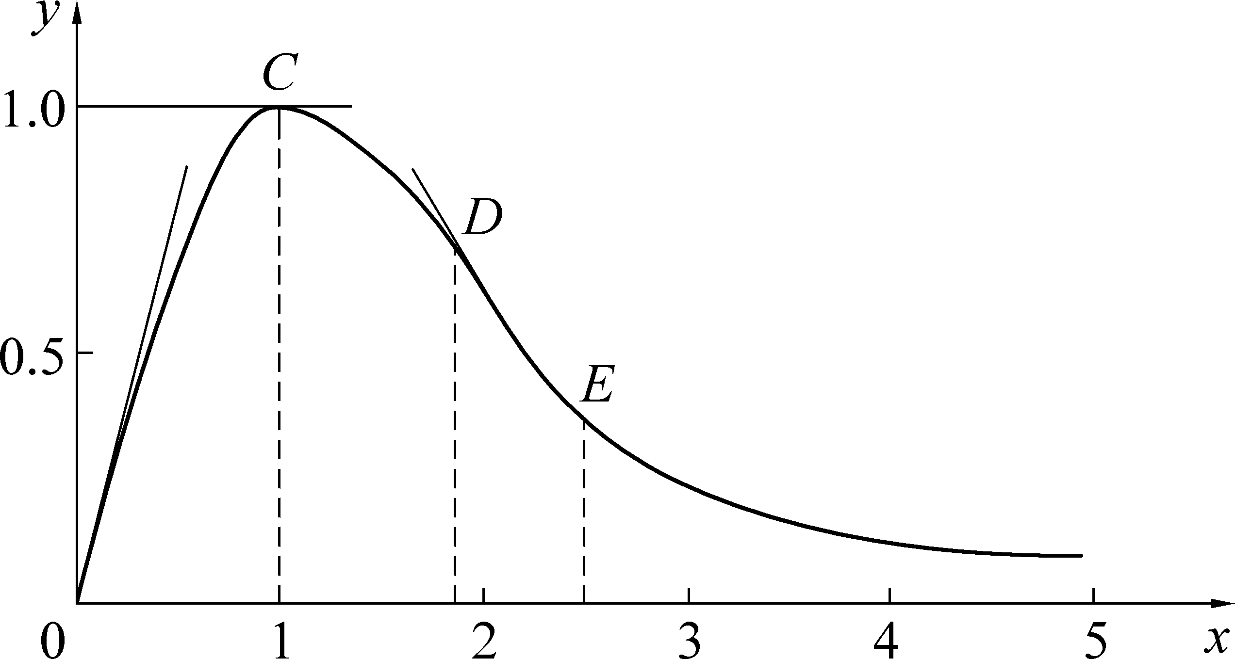 其中:fc为抗压强度;εc为与fc对应的峰值应变;σ为强度;ε为应变。此典型曲线的几何特性可用数学条件描述:①x=0,y=0;②0≤x<1,d2y/dx2<0,即上升段曲线dy/dx单调减小,无拐点;③C点x=1处,dy/dx=0和y=1,曲线单峰;④D点d2y/dx2=0处坐标xD>1,即下降段曲线上有一拐点;⑤E点d3y/dx3=0处坐标xE(≥xD)为下降段曲线上曲率最大点;⑥当x→∞时,y→0,dy/dx→0;⑦x≥0,0≤y≤1。堆积角为90°试样满足上述条件①③⑥⑦,即曲线包括上升阶段、下降阶段和收敛阶段。上升阶段包括固有微裂隙几乎不变的短暂弹性阶段;荷载超过极限应力的30%后,微裂隙开始扩展并增大阶段;荷载超过极限应力的70%~90%后,微裂隙显著扩展并迅速增加,砂浆裂缝与黏着裂缝贯穿,应力达到峰值阶段。下降阶段可见裂隙贯穿。收敛阶段,截面内裂缝之间的咬合力和摩擦力承受外力[29]。