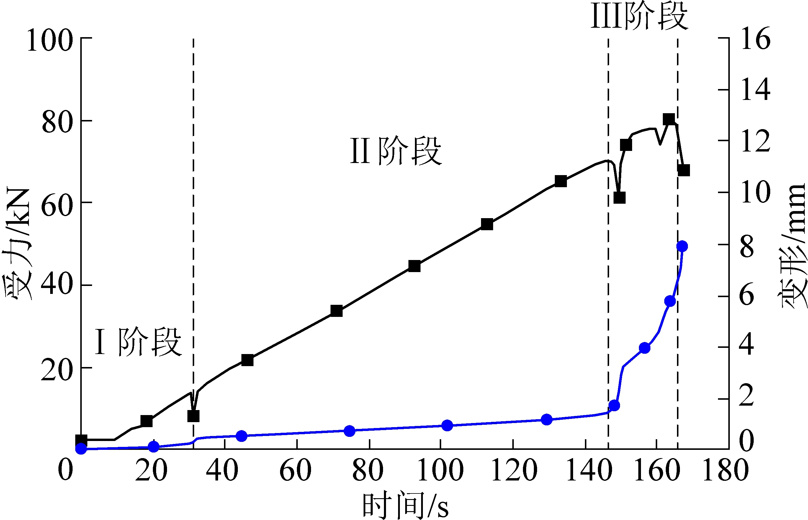 堆积角30°试样变形和受力关系如图7所示,由图7可知,堆积角30°试样的受力和变形不完全满足经典受压应力-应变关系。第1个峰值之前,曲线与经典受压应力-应变曲线一致,说明:圆台试样在受压过程中与圆柱试样相同,同样要经过固有微裂隙几乎不变的短暂弹性阶段;微裂隙开始扩展并增大阶段;微裂隙显著扩展并迅速增加,砂浆裂缝与黏着裂缝贯穿,应力达到峰值阶段。此过程可从该试样变形和受力随时间变化关系(图8)和该试样在不同时间节点下破坏图片(图9)得到证实。同时,根据图8和图9,可将堆积角30°试样的破坏过程分为3个阶段:Ⅰ短暂弹性阶段;Ⅱ裂隙扩展阶段;Ⅲ维护结构失效阶段。