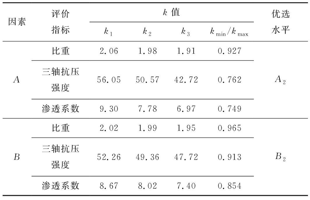 因素评价指标k值k1k2k3kmin/kmax优选水平A比重2.061.981.910.927三轴抗压强度56.0550.5742.720.762渗透系数9.307.786.970.749A2B比重2.021.991.950.965三轴抗压强度52.2649.3647.720.913渗透系数8.678.027.400.854B2