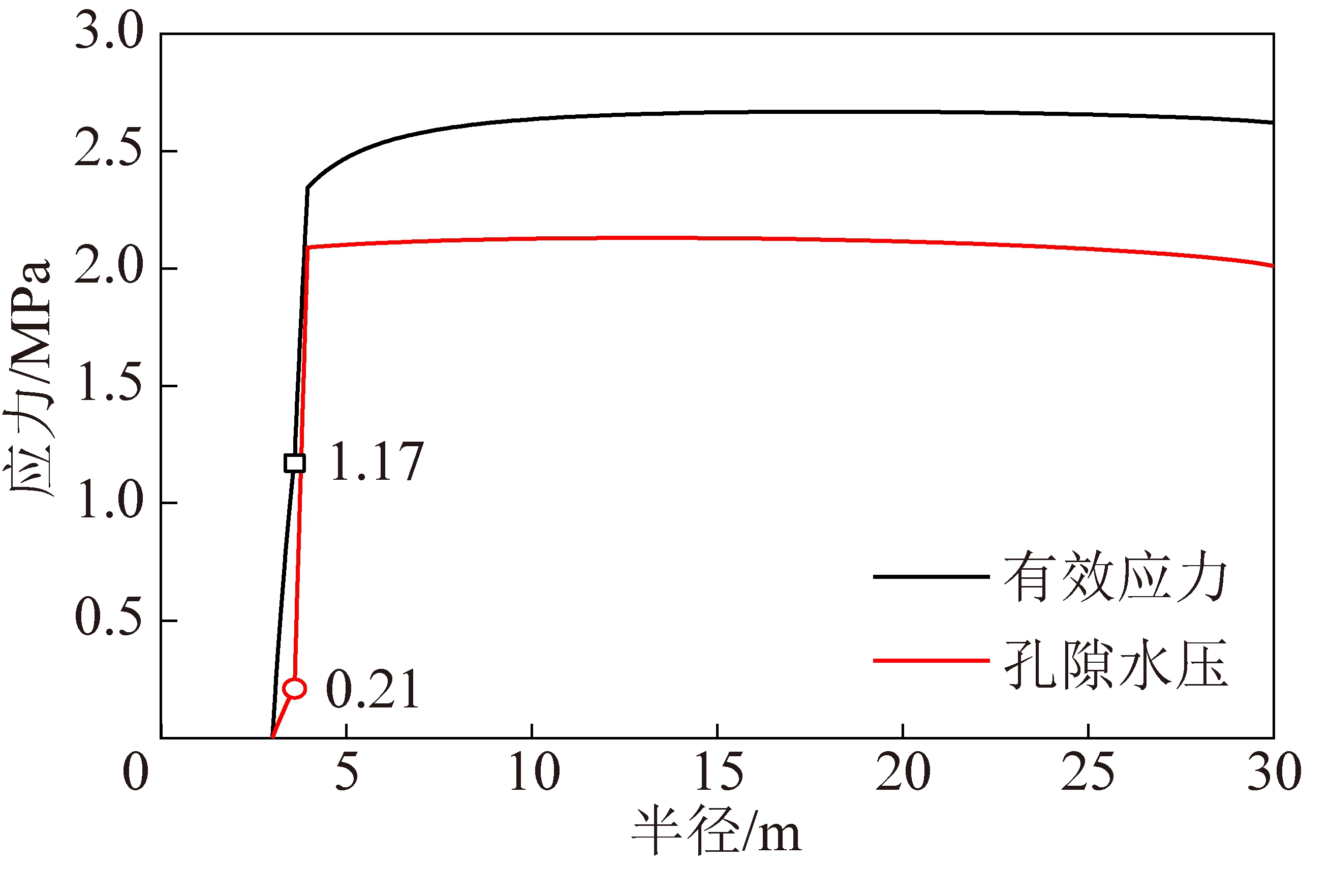 将上述计算结果导入Origin绘图软件,可得到径向有效应力和孔隙水压力分布曲线,如图4所示。