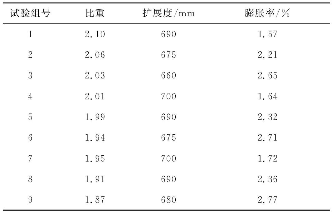 通过对表3配合比进行配制试验,分别测试拌合物的比重、扩展度及其固结后的膨胀率,试验结果见表4和图8。