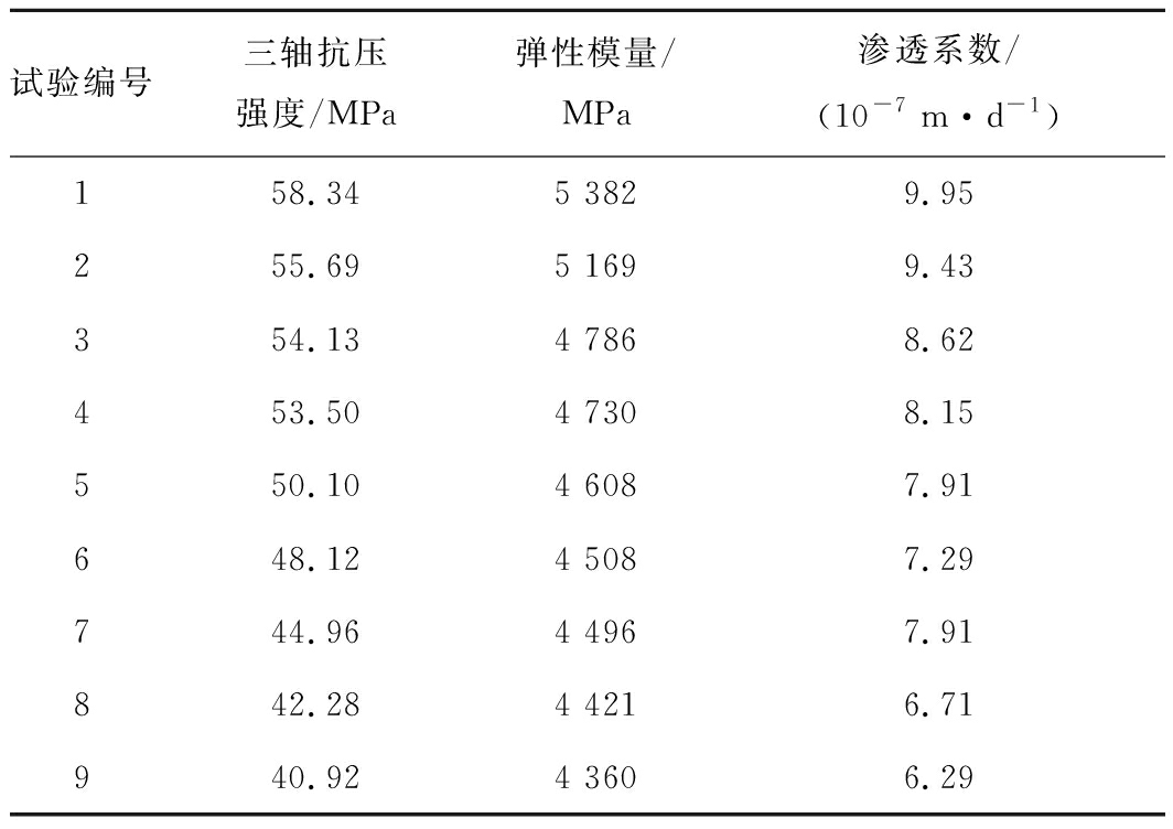 试验编号三轴抗压强度/MPa弹性模量/MPa渗透系数/(10-7 m·d-1)158.345 3829.95255.695 1699.43354.134 7868.62453.504 7308.15550.104 6087.91648.124 5087.29744.964 4967.91842.284 4216.71940.924 3606.29