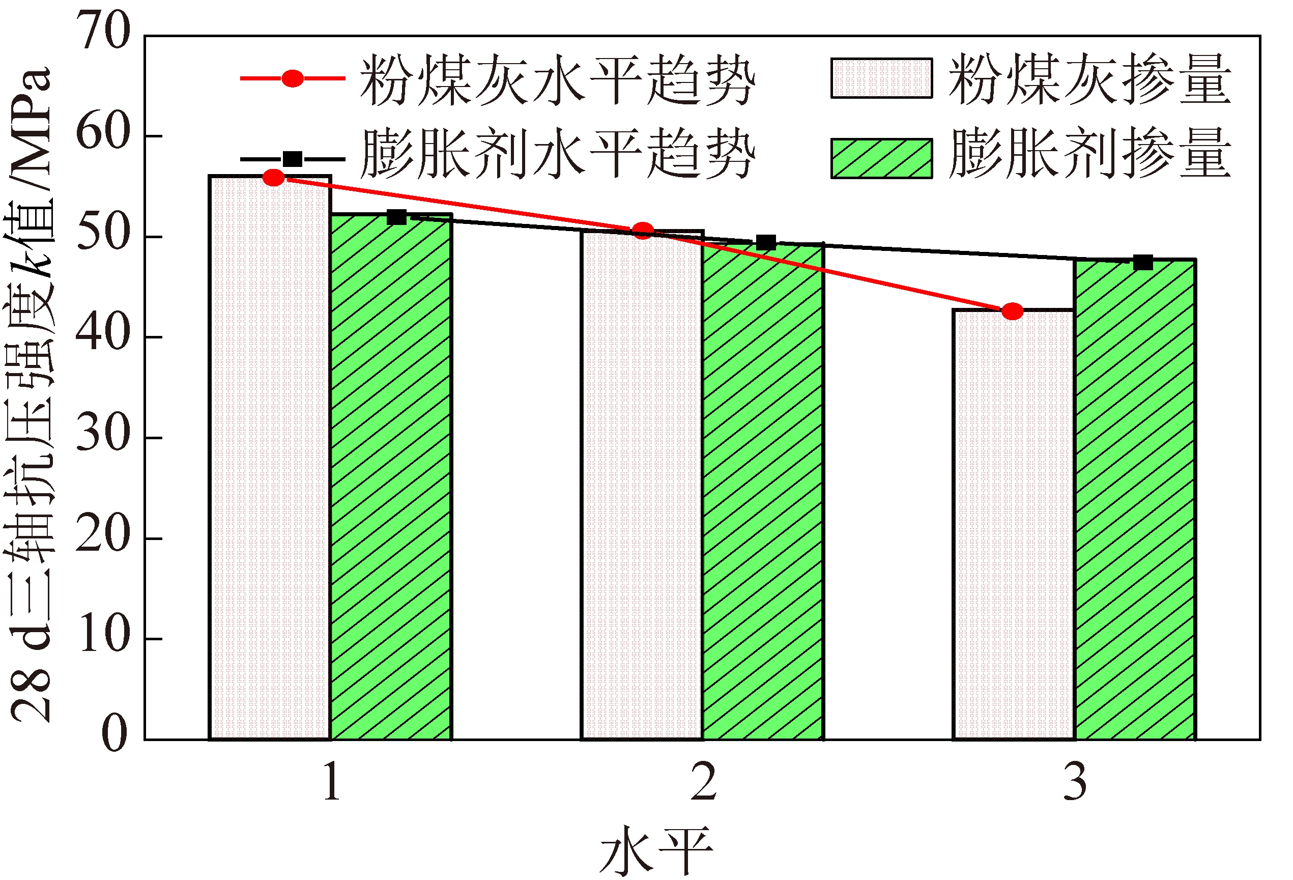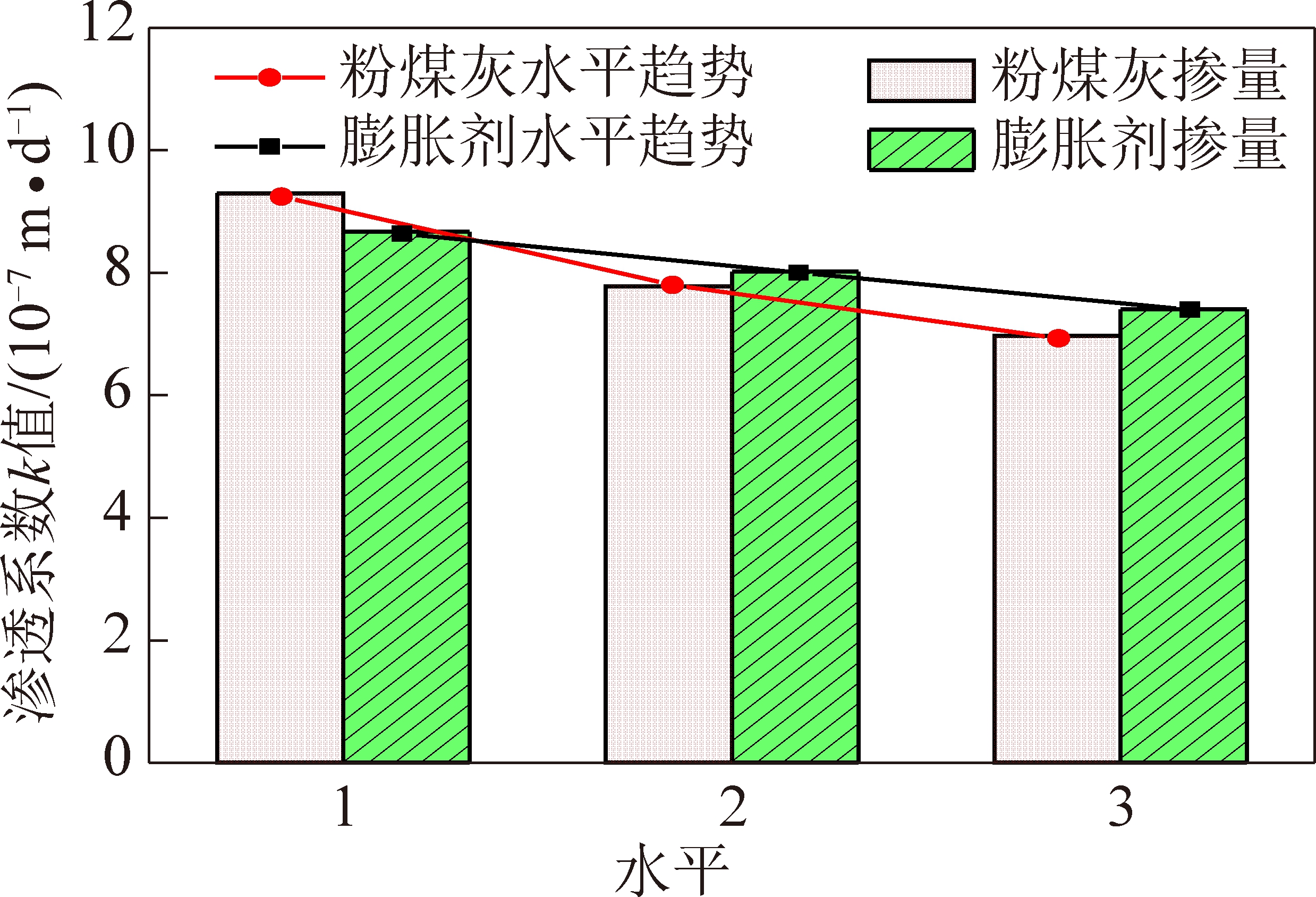 如图11所示,充填材料的弹性模量均随着粉煤灰与膨胀剂掺量水平数的增加呈线性递减的趋势。如图12所示,充填材料的渗透系数k值随着膨胀剂掺量和粉煤灰掺量的增加均呈现明显的近线性递减趋势,表明材料的抗渗性能得到了明显改善,这主要是因为粉煤灰的粒径小于水泥颗粒,能够填充更小空间,从而提高了砂浆的密实度;同时,膨胀剂水化反应不断生成的明矾石结晶发生了膨胀,补偿了砂浆的部分收缩,不断地充填水泥颗粒的缝隙,降低了砂浆微裂缝的产生。在粉煤灰与膨胀剂二者的协同作用下,充填材料的抗渗性能明显提高。另外,由图12可见,当粉煤灰和膨胀剂掺量达第2水平后,渗透系数k值下降幅度显著减小,这说明掺量水平较大时对抗渗性的提升幅度并不明显。因此,综合强度和弹性模量的考虑,选用第2水平掺量对抗渗性的提升效果为最优。