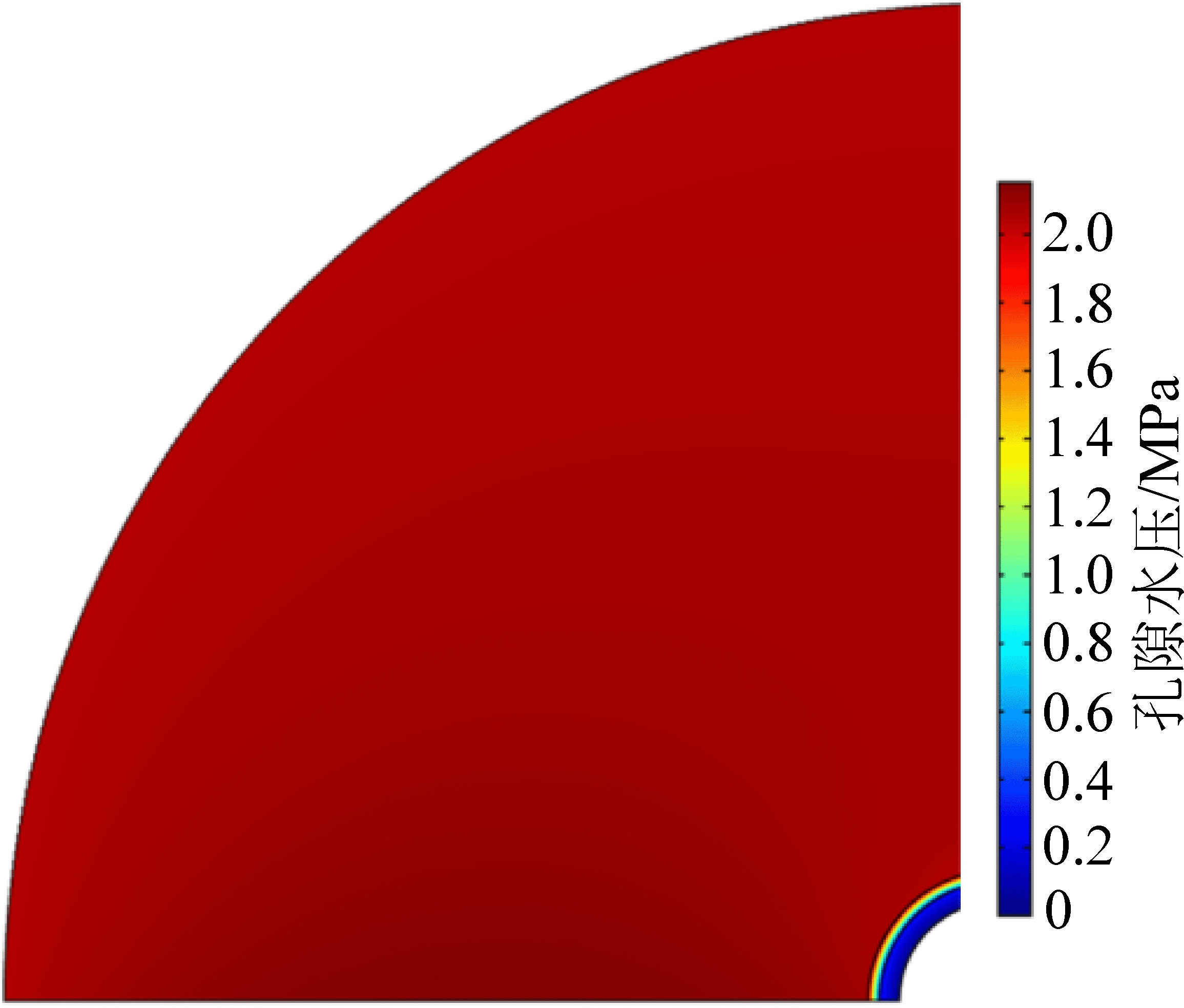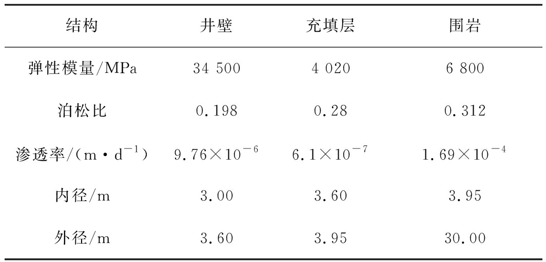 Comsol Multiphysics数值计算软件广泛用于多物理场耦合分析,因此选用Comsol有限元软件建立数值分析模型。在白垩系底部201.4 m处,井壁材料设计为C50钢筋混凝土,充填层材料选用水泥砂浆。根据秦氏公式计算得到对应水平地压为2.62 MPa,根据水头高度计算得到围岩外侧水压为2.014 MPa,井壁内侧应力为0,水的黏滞系数为0.1×10-8 MPa·s,具体计算参数见表1。