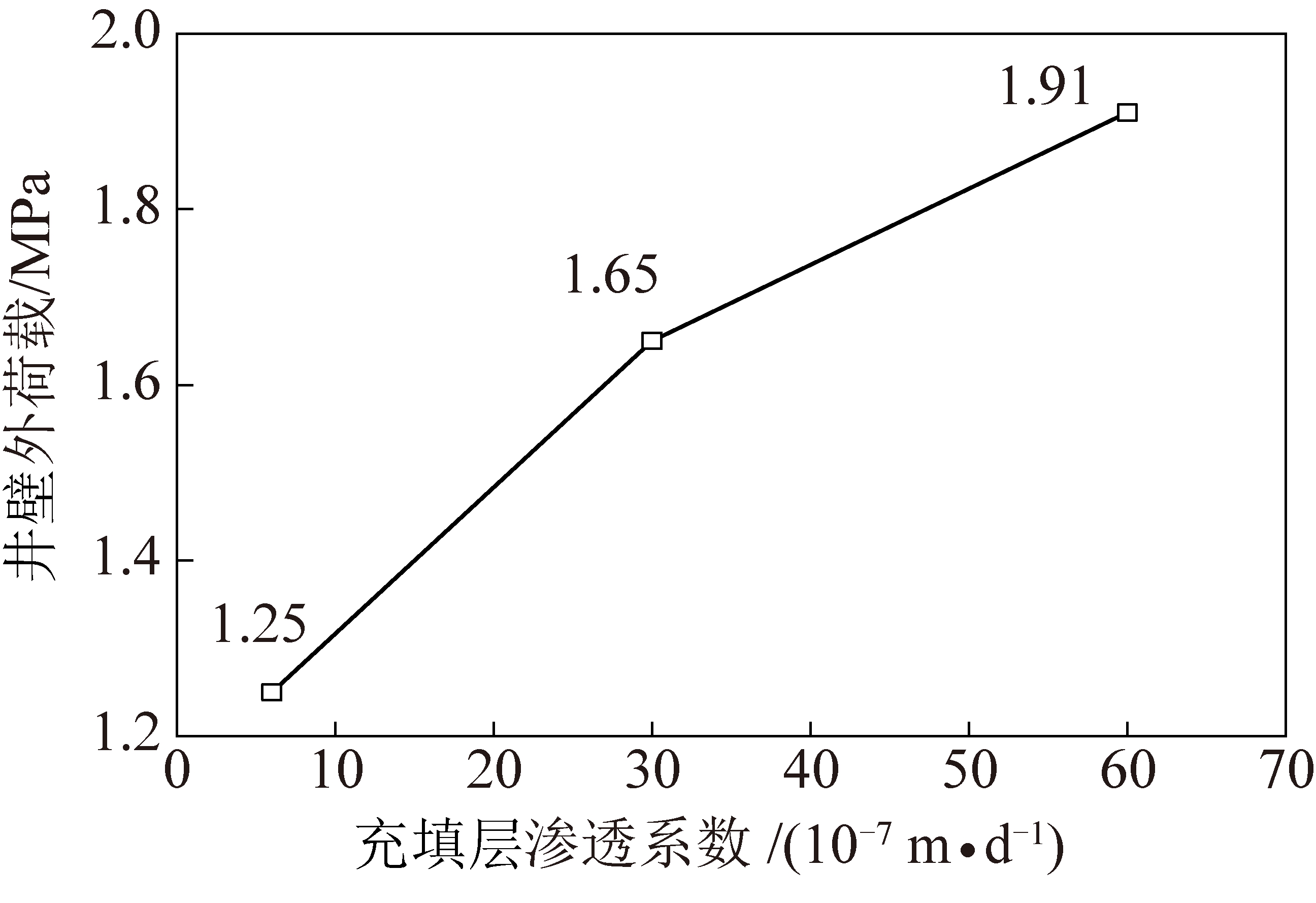 由图6可见,随着充填层渗透系数的增加,井壁承受的外荷载也增加,当渗透系数为6×10-7、30×10-7和60×10-7 m/d时,对应的外荷载分别为1.25、1.65和1.91 MPa。