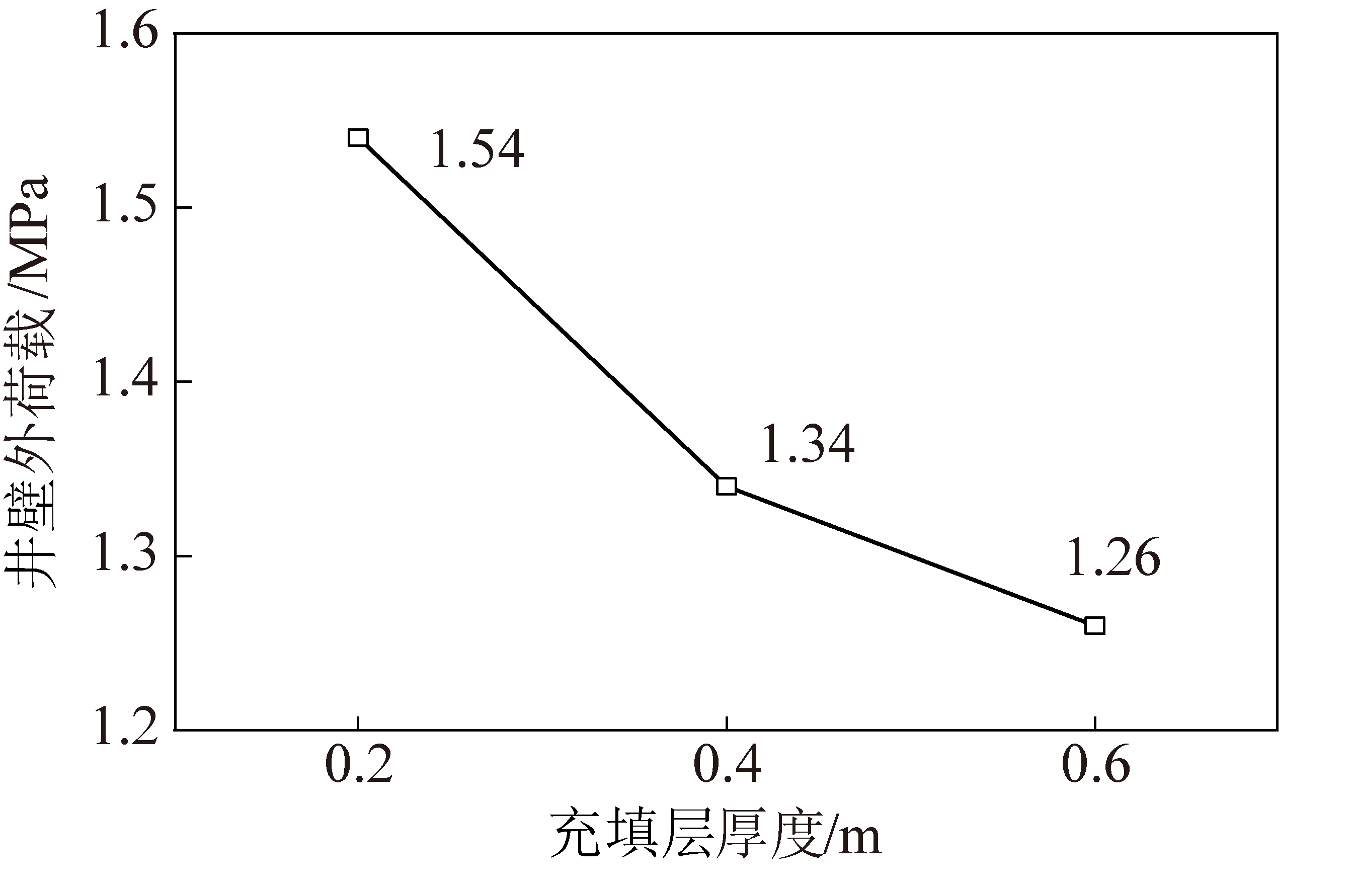 由图7可见,随着充填层厚度增加,外荷载降低,当厚度为0.2、0.4和0.6 m时,井壁承受的外荷载分别为1.54、1.34和1.26 MPa。