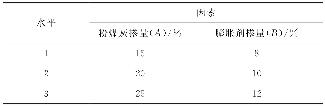 水平因素粉煤灰掺量(A)/%膨胀剂掺量(B)/%11582201032512