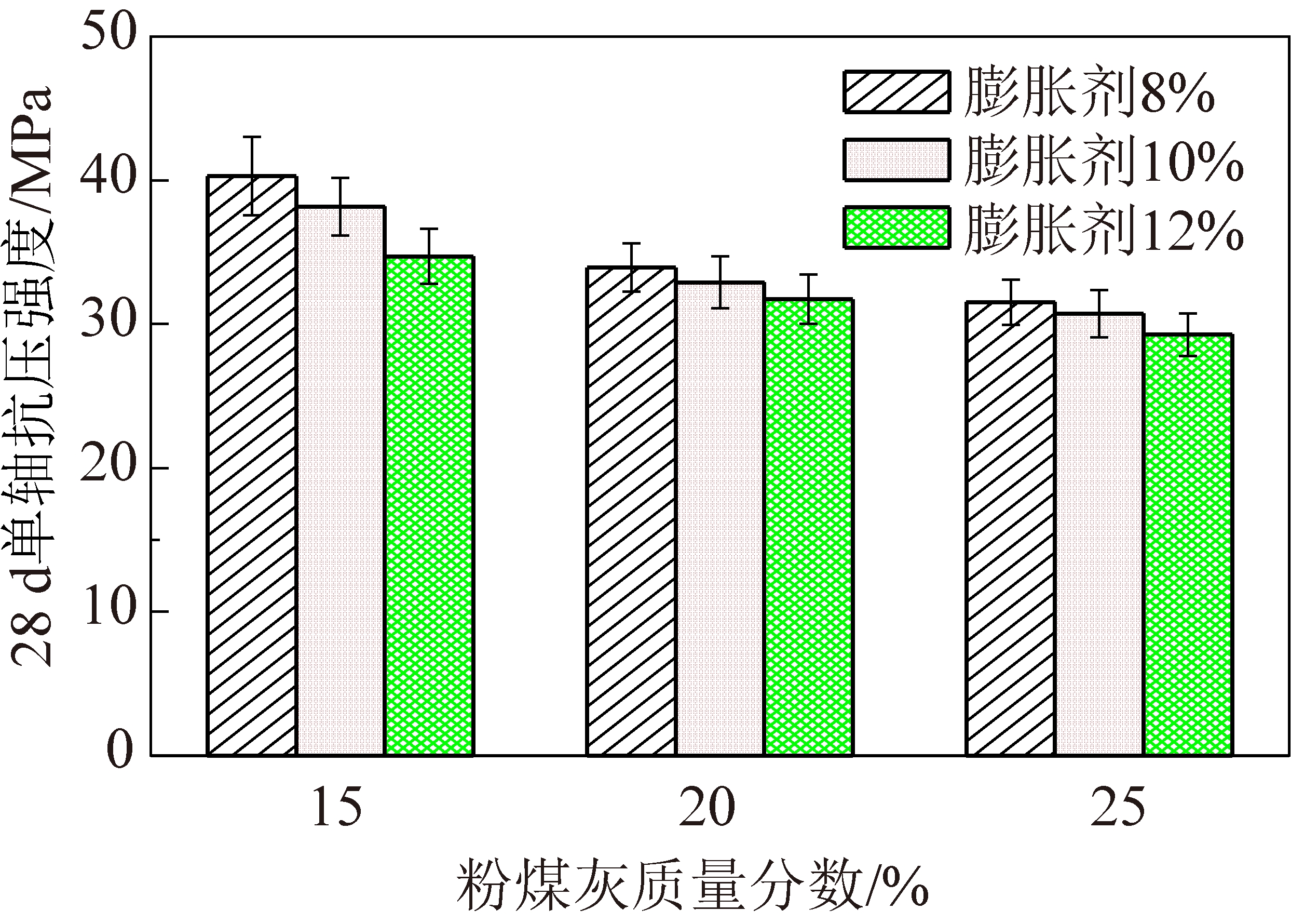 充填材料的强度指标通常采用单轴抗压强度表征,它关系到井壁的稳定性,具有较高强度的充填材料固井效果好,可防止高承压水将充填层与围岩交界面劈裂、剥离破坏,确保围岩、充填层和井壁的共同作用,减小作用在井壁上的外荷载。由表5和图9可见,随着粉煤灰和膨胀剂掺量增加,砂浆抗压强度均表现一定程度的下降趋势,因此,在确保可泵性和充填砂浆不收缩的前提下需合理确定其掺量。