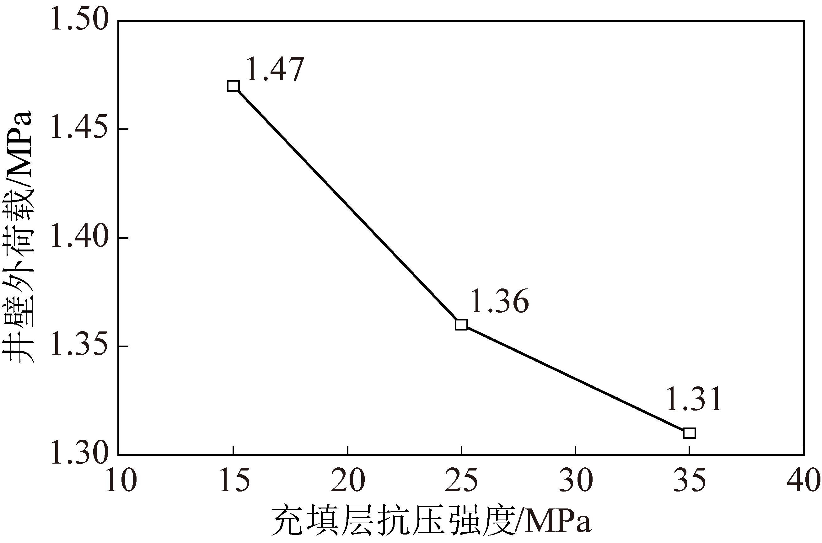 由图5可见,随着充填层抗压强度的增加,井壁承受的外荷载明显降低,当抗压强度为15、25和35 MPa时,井壁承受的外荷载分别为1.47、1.36和1.31 MPa。