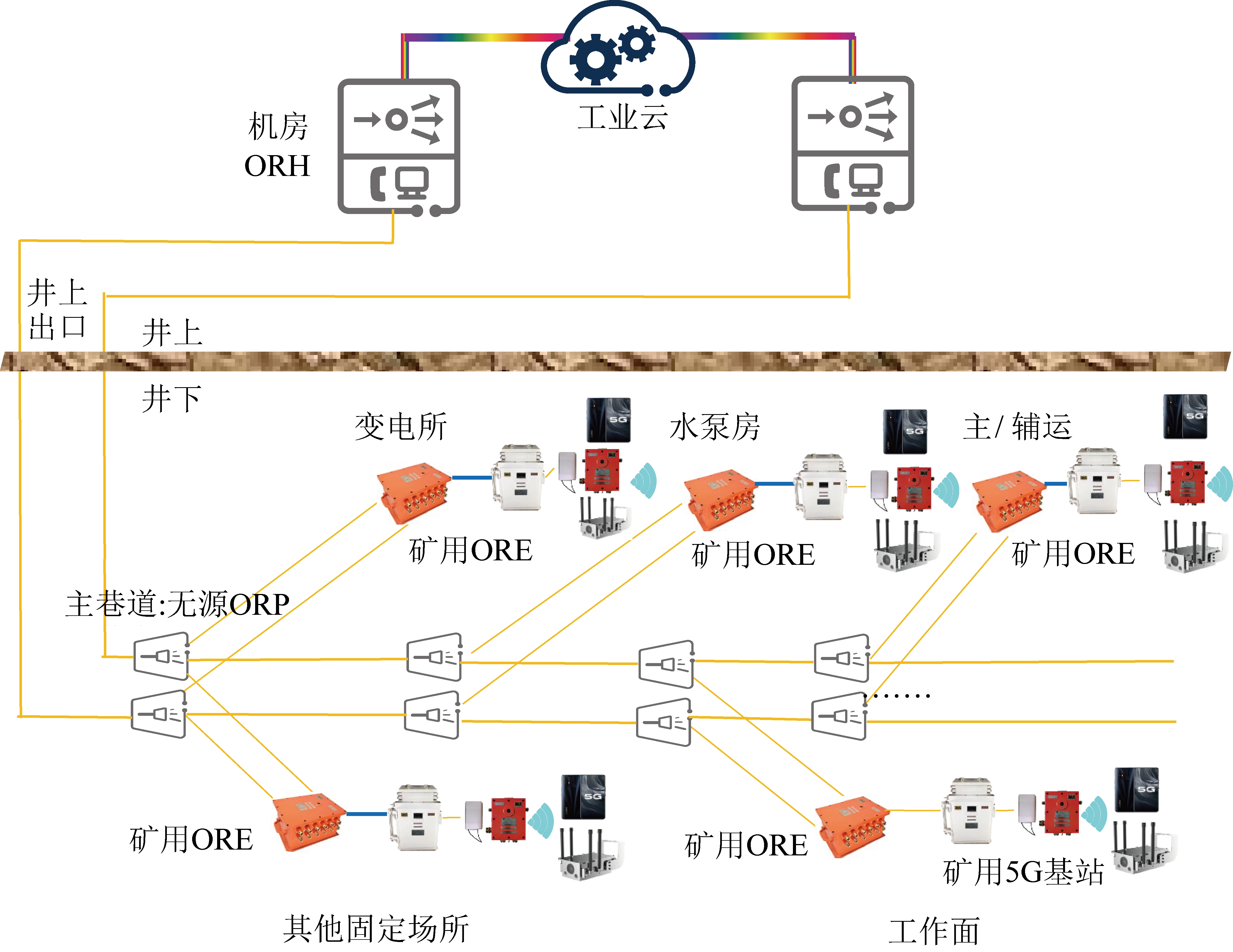矿用F5G在煤矿应用主要包含3个产品,分别为:光环网头端设备 (Optical Ring Head,ORH)、光环网终端设备(Optical Ring End,ORE)及无源光环网设备 (Optical Ring Passive ,ORP)[8]。