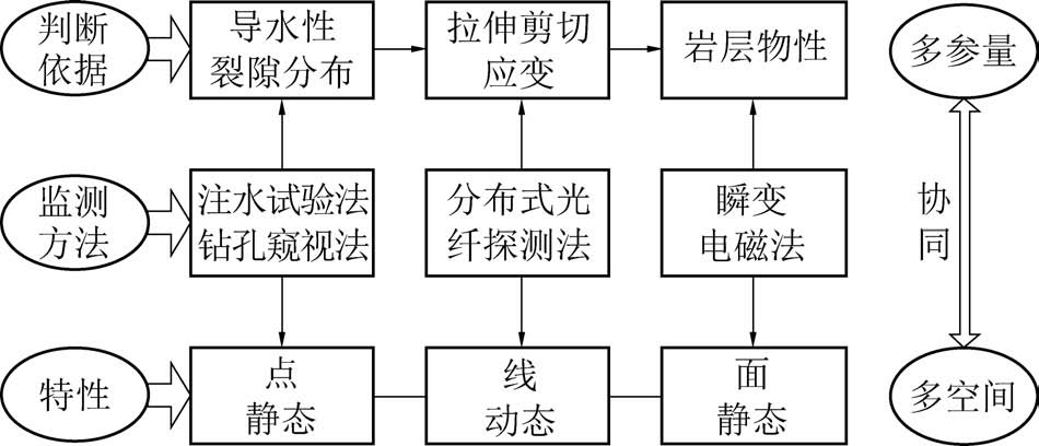 1)监测空间上实现点-线-面、动静结合监测。采用钻孔注水试验并结合钻孔窥视的手段,可获取某一位置、某一深度的采动煤层底板裂隙发育和导水特征,该裂隙发育特征为静态分布特征(单一时刻的);采用光纤感知测试技术可获取某一位置、不同深度、离工作面不同距离、不同回采阶段的煤层底板变形特征,该特征为动态分布特征;采用瞬变电磁法,则可获取整个回采工作面不同位置、不同深度的采动煤层底板裂隙发育特征,该裂隙发育特征为静态分布特征。