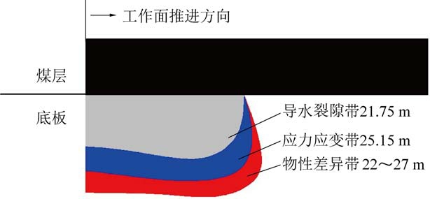 2)分别从导水裂隙发育特征、底板应力应变特征、物性差异特征进行分析,根据煤层底板采动破坏程度将煤层底板受采动影响岩层按层次性特征,划分为导水裂隙带、应力应变带和物性差异带。