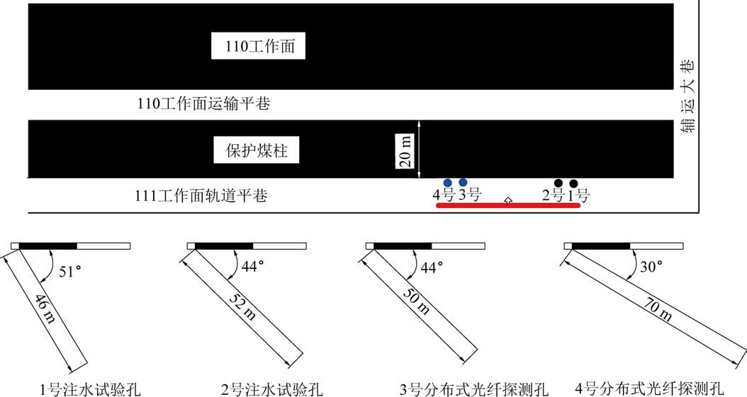 共布置2 个注水孔在距巷口450 m 位置,待工作面推过设计钻孔位置5 d 后,施工该组钻孔并进行注水试验和钻孔窥视观测。 布置2 个分布式光纤探测孔在距巷口900 m 的位置,待工作面推进至距离设计钻孔位置100 m 时,施工该组钻孔并埋设光纤传感器并开始观测,直至工作面推过钻孔位置100 m 后结束观测。 瞬变电磁法探测共进行2 次,首次观测在工作面推进至距离采区辅运大巷(图5)1 000 m 时,末次观测为工作面回采结束,具体布置方案如图5 所示(1、2 号孔为注水试验孔,3、4 号孔为分布式光纤探测孔;钻孔是在111 工作面轨道平巷向110 工作面采空区的底板方向施工的;钻孔的倾角是以煤层为水平方向,将斜向110 工作面采空区底板的角度作为标识)。