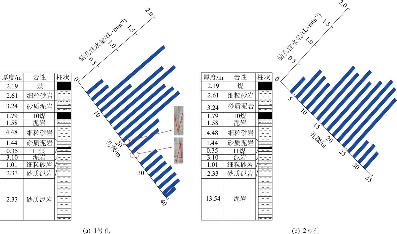 从图6a 中可以看出,靠近煤层底板的岩性为泥岩、泥质石灰岩,整体漏失量相对较小,而距离煤层底板约6 m 范围为11 煤,该煤层含少量方解石脉,夹矸多为泥岩,原生裂隙相对较为发育,整体漏失量较大,最大为1.72 L/min。 据钻孔窥视发现,该层岩体裂隙相对发育。 距煤层底板17.68 m 处为泥岩,该层位受泥质成分影响,渗透性能相对较差,距离煤层底板18.64 m 处的采动裂隙岩体漏失量为0.82 L/min。 而距煤层底板21.75m 处的采动裂隙岩体漏失量明显减小,其漏失量为0.42 L/min。 结合钻孔注水漏失量趋势来看,判断煤层底板采动破坏深度为18.64~21.75 m。 同时,从图6 中钻孔窥视图可以看出,钻孔深度20 m 位置的底板采动裂隙分布特征为较为明显的剪切裂隙,钻孔探测深度26 m 左右的同样产生较大倾角的剪切裂隙。 考虑该处钻孔倾角等因素,确定煤层底板破坏深度为20.02 m,与采动裂隙岩体漏失量基本吻合。 综合分析认为该处受采动支承压力影响,煤层底板破坏深度为20.02~21.75 m。