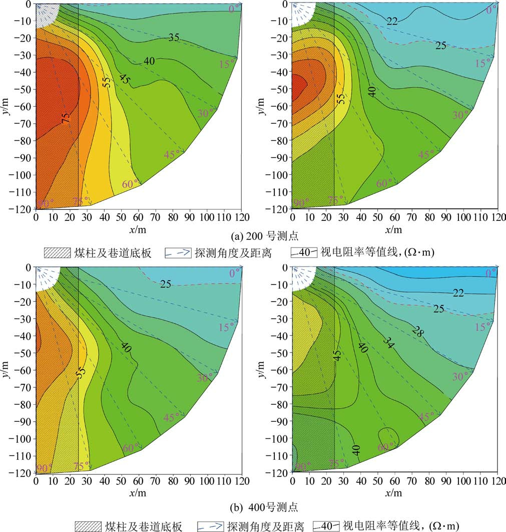 图9 110 工作面9 煤200 号和400 号测点采前和采后视电阻率剖面对比