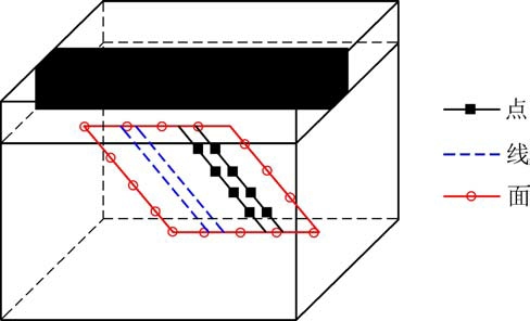 基于上述设备监测原理和思路,构建了如图2和图3 所示的煤层底板采动扰动破坏范围的全空间多参量协同监测模式。 采用钻孔注水试验法和钻孔窥视法,进行底板裂隙分布的点式、静态监测;采用分布式光纤探测,线式、动态地获取底板拉伸或剪切变形,根据变形量判断底板破坏特征;采用瞬变电磁法进行面式、静态获取底板岩体因采动引起的物性变化,用于分析煤层底板采动扰动破坏范围,从监测内容上方法上,4 种监测方法可实现煤层底板变形破坏的多参量协同监测;从探测方法上,4 种监测方法获取的底板破坏或扰动破坏程度从纵向上是逐渐递进的;从监测空间上,可以看出钻孔注水试验法、钻孔窥视法、分布式光纤探测法和瞬变电磁法可全空间获取煤层底板变形破坏特征,而且范围是逐渐增大的;从监测特性上,4 种监测方法可实现煤层底板破坏的动静态监测。 协同监测模式为采动煤层底板破坏范围的层次性划分提供了依据。