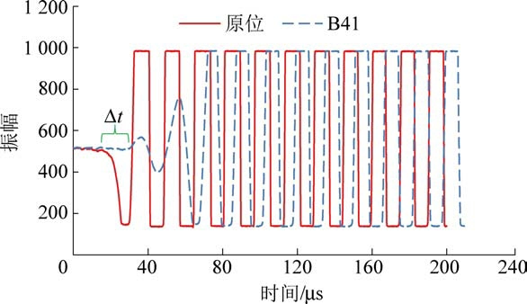 测试系统换能器间的原位波形特征和B41 岩石试件测试波形特征如图2 所示。 根据测试结果可以看出,岩石试件测试时,声波脉冲信号初至时间明显增大。 由于岩石单轴压缩过程中记录的波列数据量大,为便于数据处理,基于Matlab 平台开发了脉冲信号初至时间智能拾取的Pickup 程序模块,简化了数据处理流程,减小了人为误差,提高了求解速率和准确性。