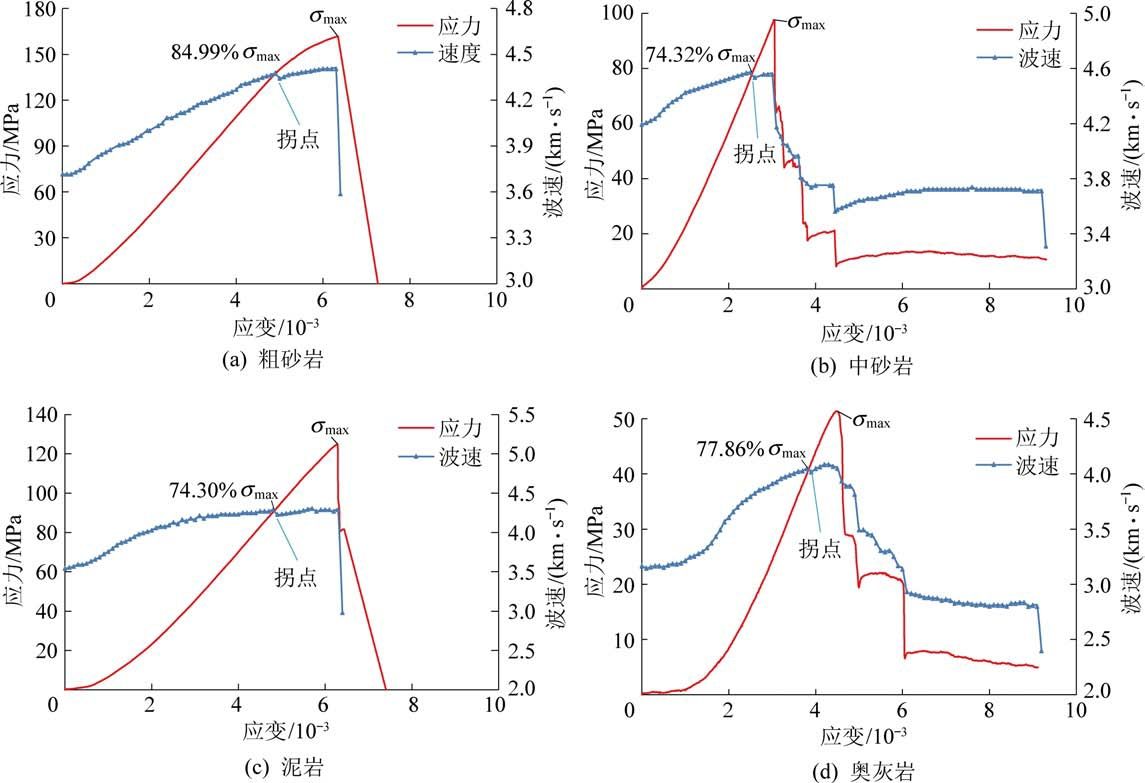 选取西区具有代表性的4 个不同岩样(粗砂岩、中砂岩、泥岩及奥灰岩)进行加载过程波速变化规律分析,岩石应力-应变全过程曲线、波速-应变曲线如图4 所示。