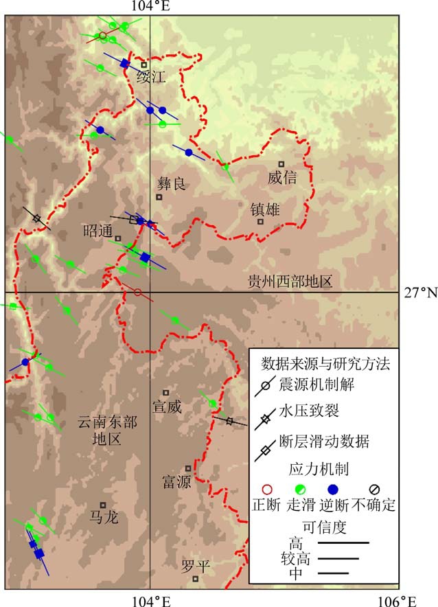 现今地应力方向在油气勘探、开发和钻井工程中具有广泛应用。 一般而言,可以通过震源机制解反演、钻孔崩落特征、钻井诱导张裂隙特征、压裂隙微震监测等方法确定[6,9-10]。 研究主要依据最新的2016 版全球应力图(World Stress Map,WSM)数据库[23-24]进行现今地应力场方向的分析,结果显示,滇东-黔西地区水平最大主应力方向总体为WNW-ESE 向(图4)。