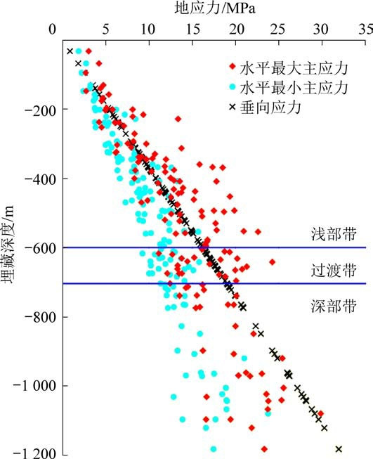 Fig.5 Vertical distribution of in-situ stresses in eastern Yunnan and western Guizhou regions