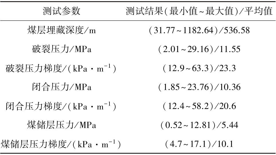 测试参数测试结果(最小值~最大值)/平均值煤层埋藏深度/m(31.77~1182.64)/536.58破裂压力/MPa(2.01~29.16)/11.55破裂压力梯度/(kPa·m-1)(12.9~63.3)/23.3闭合压力/MPa(1.85~23.76)/10.36闭合压力梯度/(kPa·m-1)(12.4~58.2)/20.6煤储层压力/MPa(0.52~12.81)/5.44煤储层压力梯度/(kPa·m-1)(4.7~17.1)/10.1