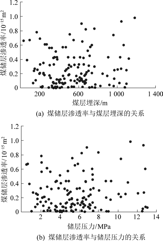 图7 滇东-黔西地区二叠系煤储层渗透率与煤层埋深和储层压力之间关系
