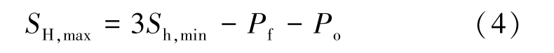 式中:Sh,min 为水平最小主应力,MPa;Pc 为闭合压力,MPa。水平最大主应力可依据下式计算[25]: