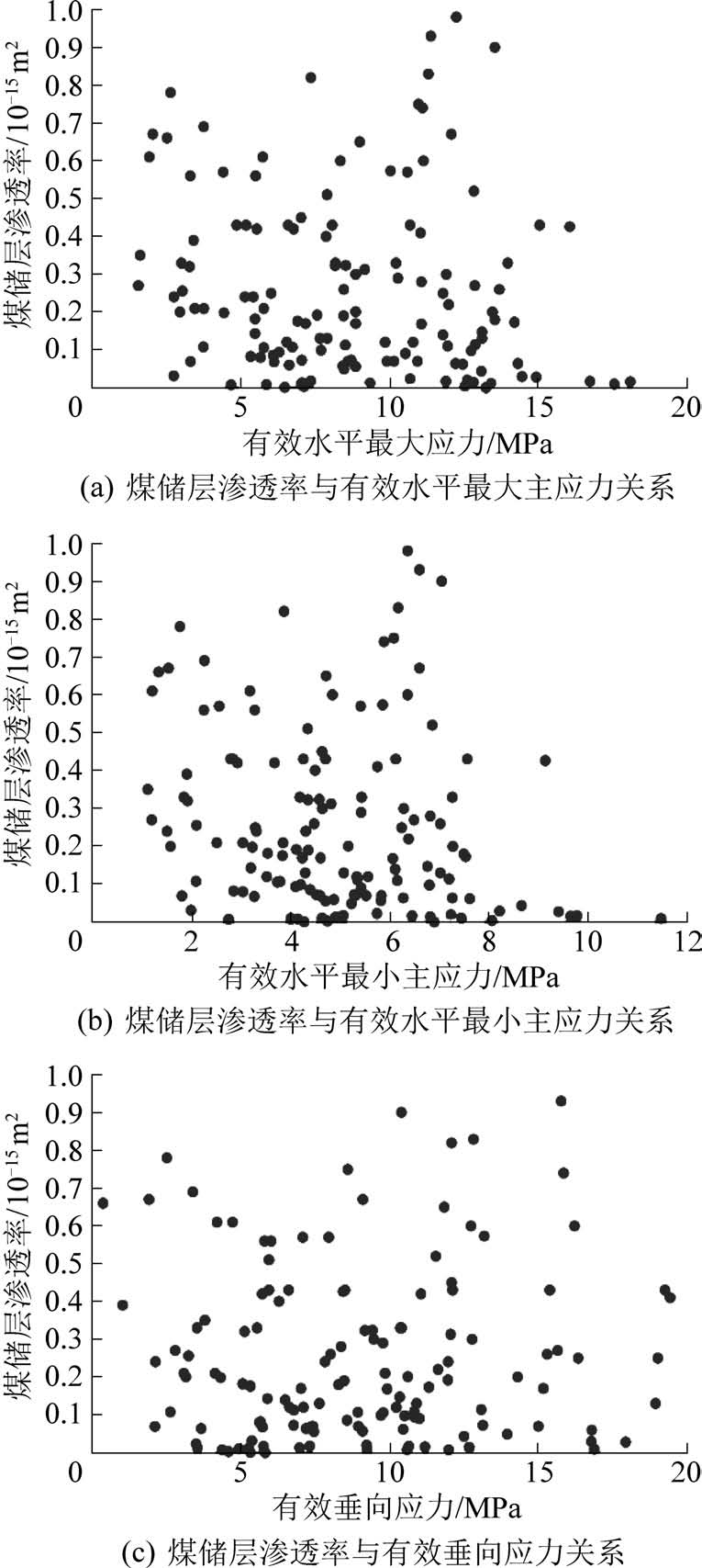 滇东-黔西地区二叠系煤储层渗透率变化受多种因素综合影响,单一的煤层埋深、储层压力等因素对研究区渗透率的控制不明显,天然裂隙状态及其与现今地应力场耦合可能是控制研究区二叠系煤层渗透率的重要因素。