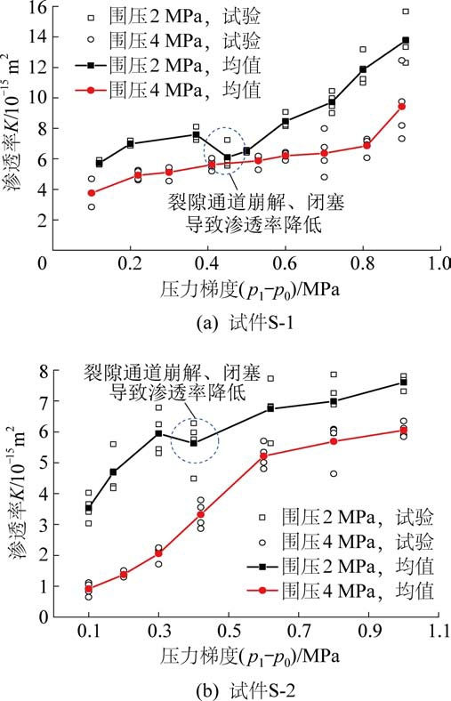 Table 2 Permeability test results of rock sample S-2 under different confining pressures and water pressure gradients