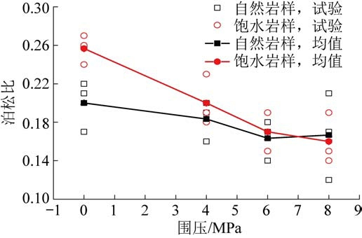 Fig.6 Evolution of Poisson’s ratio of natural and water-saturated rock samples with confining pressure
