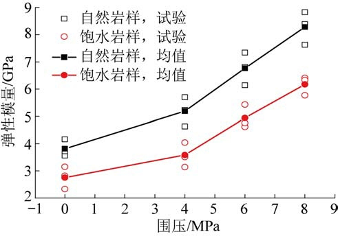 图5 自然和饱水岩样弹性模量随围压演化规律