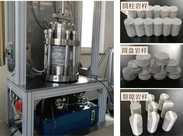 试验所用岩石样品均来自神东矿区布尔台矿某地面钻井,为煤层顶板砂质泥岩,埋深450 m 左右,密度为2.44 g/cm3。 选取部分岩样,开展岩石的自然含水率测试和自然浸泡吸水试验。 试验前对部分岩样进行105 ℃烘干24 h 处理,自然冷却后采用纯水浸泡至饱和。 经测试,试验所用砂质泥岩的自然含水率为1.3%,饱和含水率为5.9%。 钻芯进一步加工成2 类试验所用标准岩样。 一类为直径(50±1) mm、高度(100±2) mm 的圆柱试样,用于压缩和渗流试验;另一类为直径(50±1) mm、高度(25±1)mm 的圆盘试样,用于巴西劈裂试验。 岩样要求上下端面平行度和端部平面度均小于0.02。 试样加工完成后需进行表面光滑处理,挑选出表面不含明显节理、裂缝等缺陷的岩石试样用于试验。