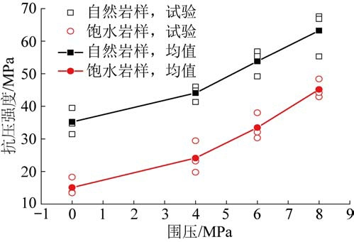 图4 自然和饱水岩样抗压强度随围压演化规律