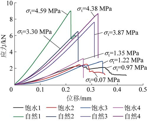图3 自然和饱水岩样巴西劈裂力-位移曲线对比