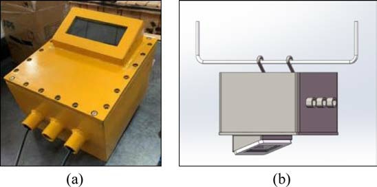 防爆样机实物图、防爆样机悬挂图分别如图3所示。 样机后部设有吊耳、挂钩,以螺栓紧固或悬挂的方式安装在液压支架横梁下。 此外,为方便激光雷达进行扫描测量,防爆玻璃视窗与基础表面呈45°夹角。