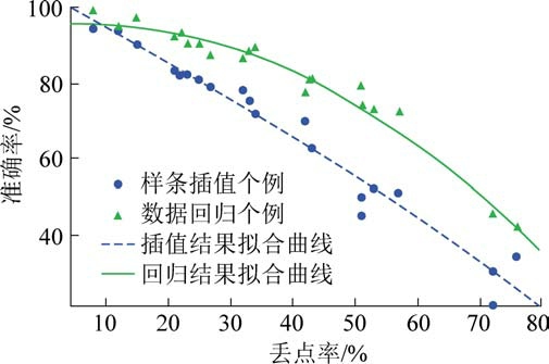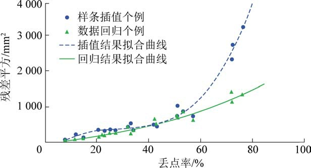 如图9、图10 所示,对验证集分别使用三次样条插值算法和数据回归算法,以丢点率为自变量,准确率、残差平方为因变量,绘制离散点拟合曲线图。随着验证集数据丢点率的升高,2 种方法的准确率都有明显的下滑,残差平方有明显的上升趋势,但由拟合曲线可以看出数据回归算法的准确率要高于三次样条插值算法,数据回归算法的平均残差要低于三次样条插值算法。