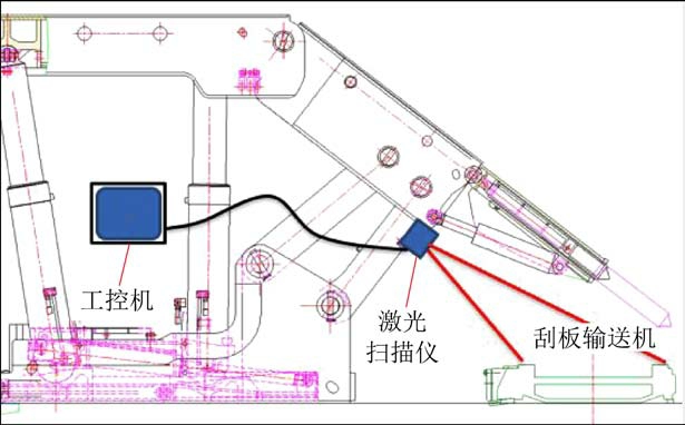 综放工作面的放煤是通过放煤支架尾梁摆动和插板伸缩动作实现的,支架上部煤岩通过后尾梁顺势垮落到支架后部刮板输送机上方,放出的煤和矸石通过刮板输送机运出。 由于后尾梁向支架立柱方向摆动后,会对放煤口位置产生遮挡,无法直接测量获得放煤口位置的煤流动态几何信息。 因此,综放工作面放煤量实时监测的关键是获得邻近放煤口位置的刮板输送机上部煤流运动的特征信息,通过刮板输送机上的煤流特征信息推算堆煤量和放煤量大小。